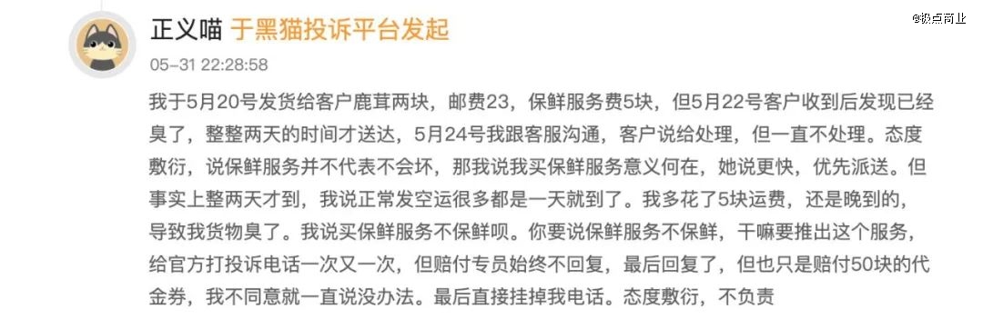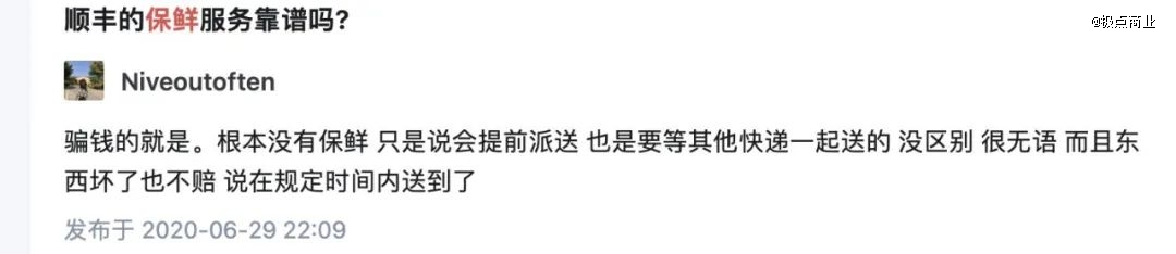 更重要的是,从社交平台反馈来看,大量网友反映顺丰收了保险费,却未能履行保鲜和保障义务。