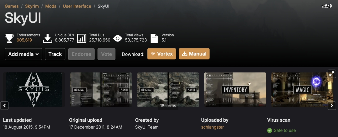 有个《上古卷轴 5 》的界面美化 MOD,把原版游戏那个堪称垃圾的界面收拾的干净又方便,它的总下载量高达 2571 万。