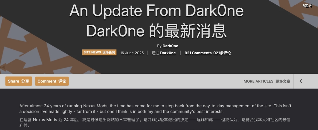 所以,为了 Make N网 Great Again,他找了几个和他一样热爱 MOD 的人接手。自己还会在N网工作,但不再是那个为决策最终拍板的负责人了。