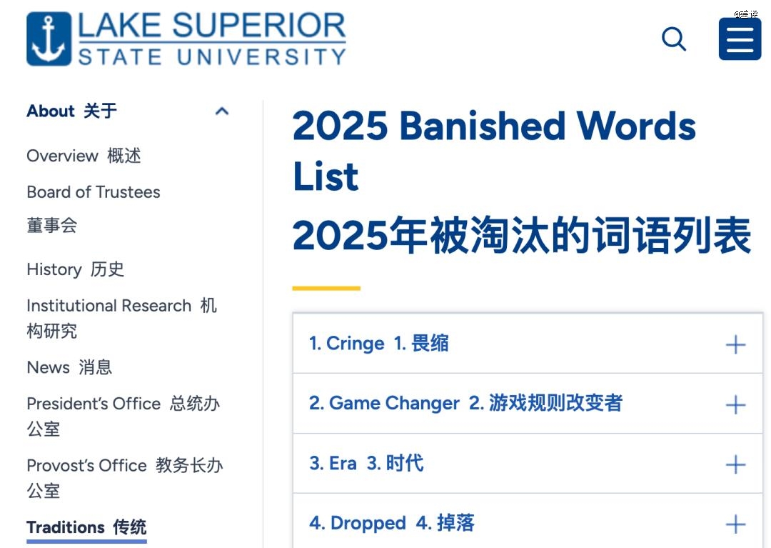 像苏必利尔湖州立大学就有个传统,那就是每年出个禁用词列表,专门把那些过度使用、不合逻辑、荒谬的词语列为禁词。
