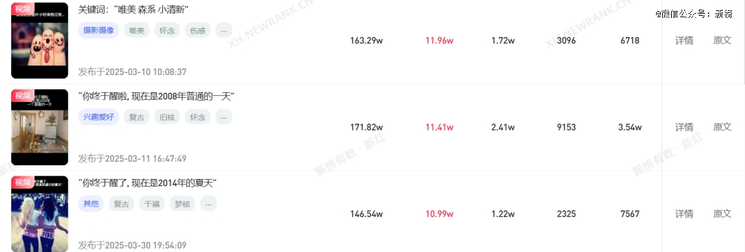 据新榜编辑部不完全统计,与这些怀旧内容同框出现的,包括但不限于#古早、#2000s、#千禧年、#中式梦核、#经济上行的美 等多个相关话题,全网累计浏览量超过百亿次,其中不乏百万点赞爆款和涨粉案例。