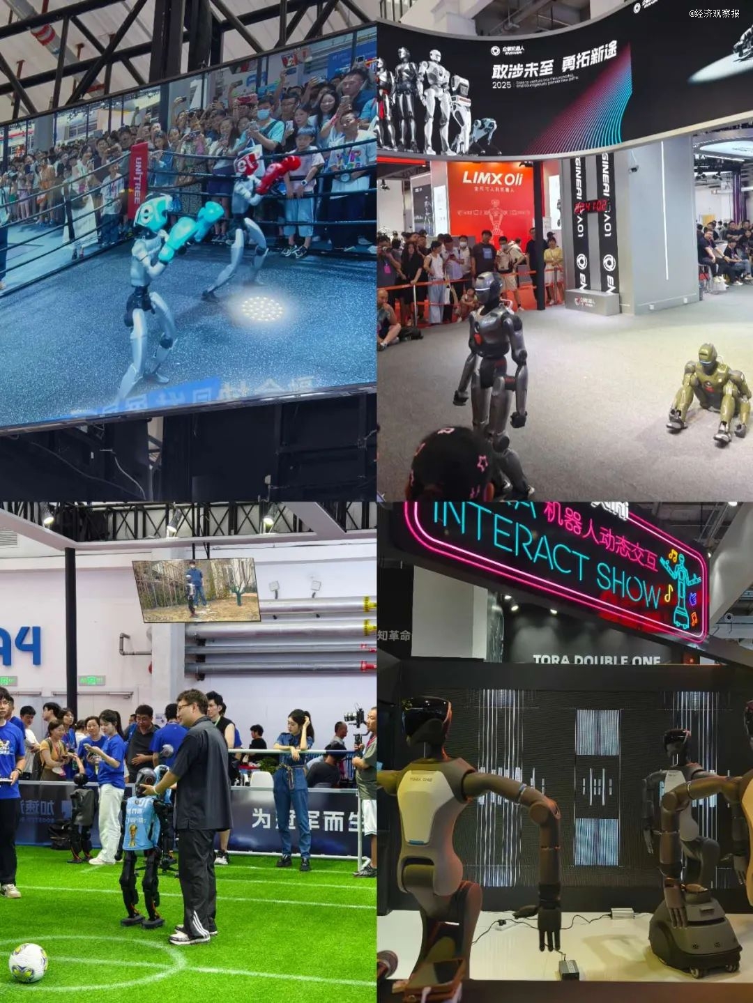 展区热闹非凡:宇树科技的格斗赛人头攒动、众擎机器人穿着“钢铁侠”涂装走秀……吸睛场面比比皆是。