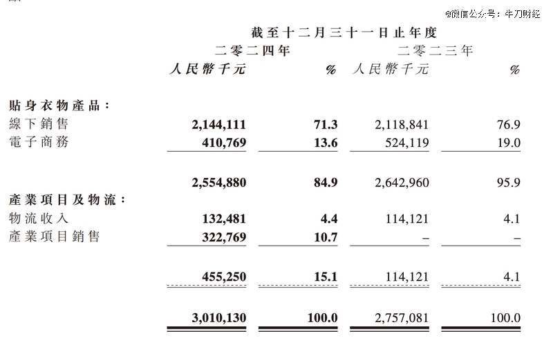 2024年“贴身衣物产品”线下销售额21.44亿元,仅较上年增长1.2%,与超4500家的门店规模形成反差,尽管公司计划2025年将门店扩至5000家,但单店收入下滑导致加盟商经营压力持续加大。