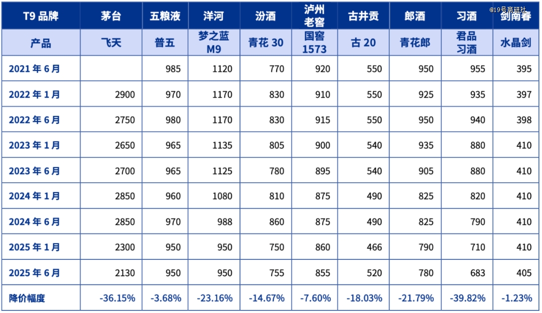 近5年T9品牌主要产品价格变化情况。图源:《2025中国白酒市场中期研究报告》