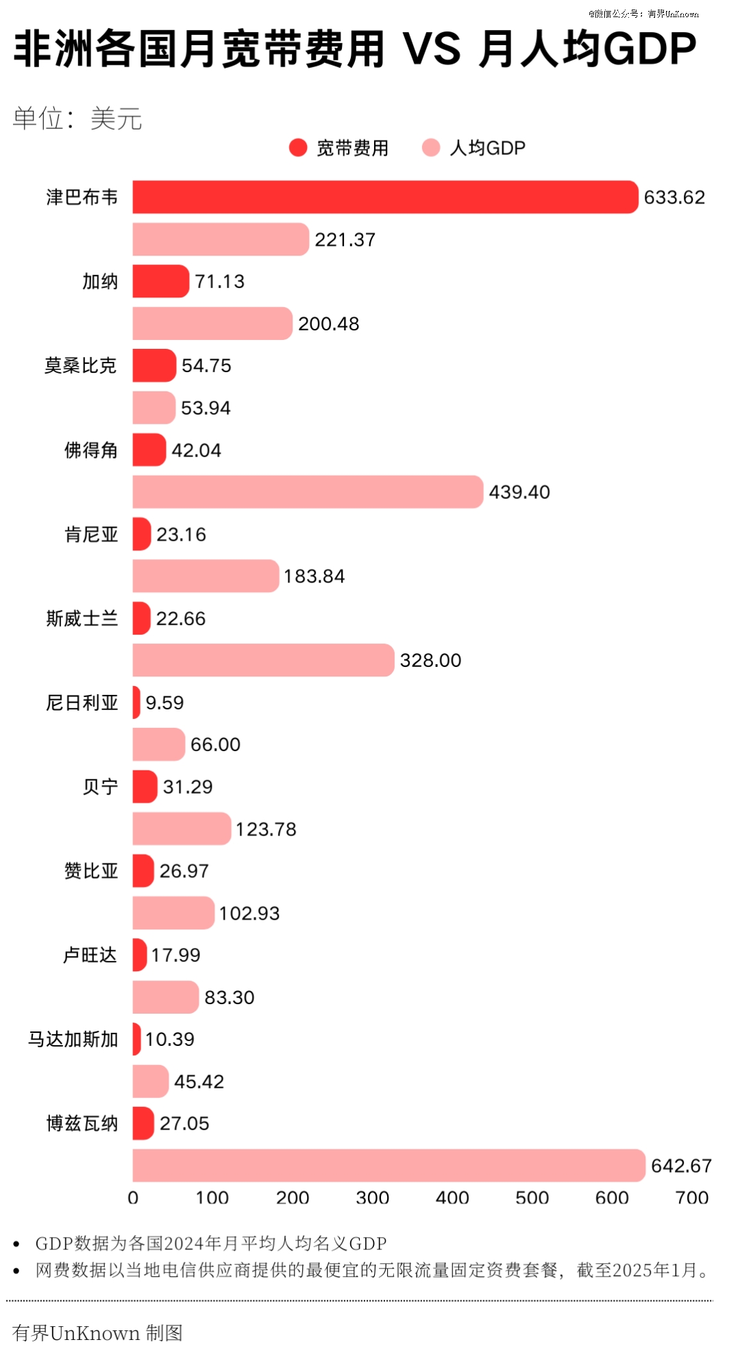 这一点与非洲许多国家宽带费用昂贵有关,以津巴布韦、加纳和莫桑比克等极端地区为例,他们每月的宽带费用分别是633.62美元、71.13美元和54.75美元;而这三个国家的人均GDP每月却仅有221.36美元、200.48美元和53.94美元。