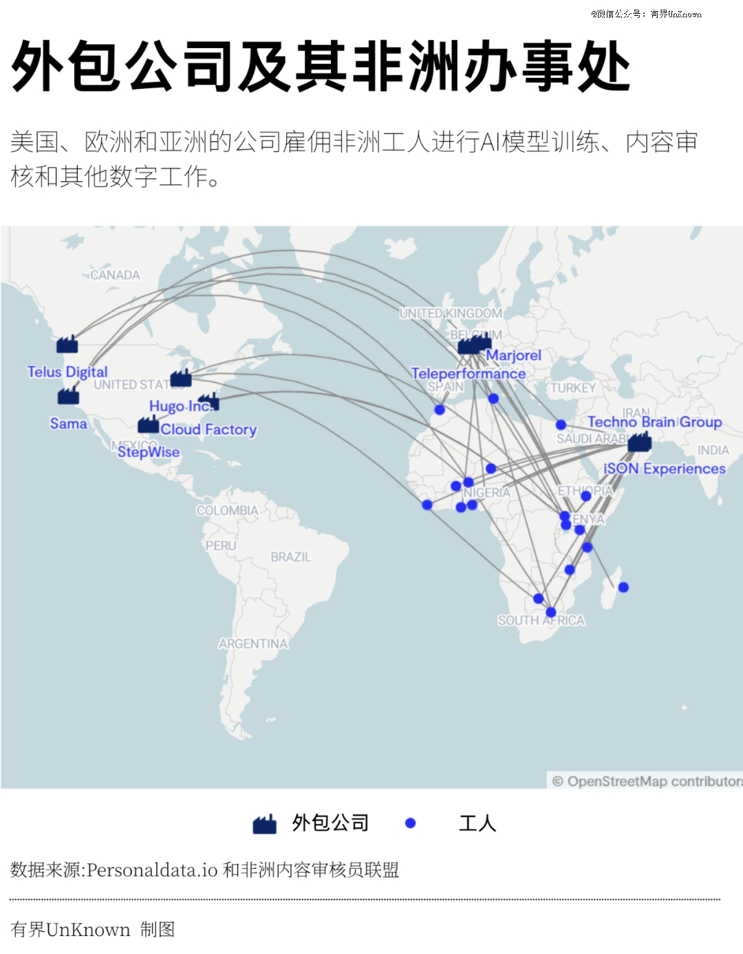 非洲内容审核员联盟(ACMU)和Personaldata.io共同开展的一项调查显示,非洲有39个国家参与到这项工作中,他们处理好的数据通过位于阿联酋、北美和欧洲的数据外包公司(其中有四家外包公司位于非洲)最终流向Meta、OpenAI和三星等客户。