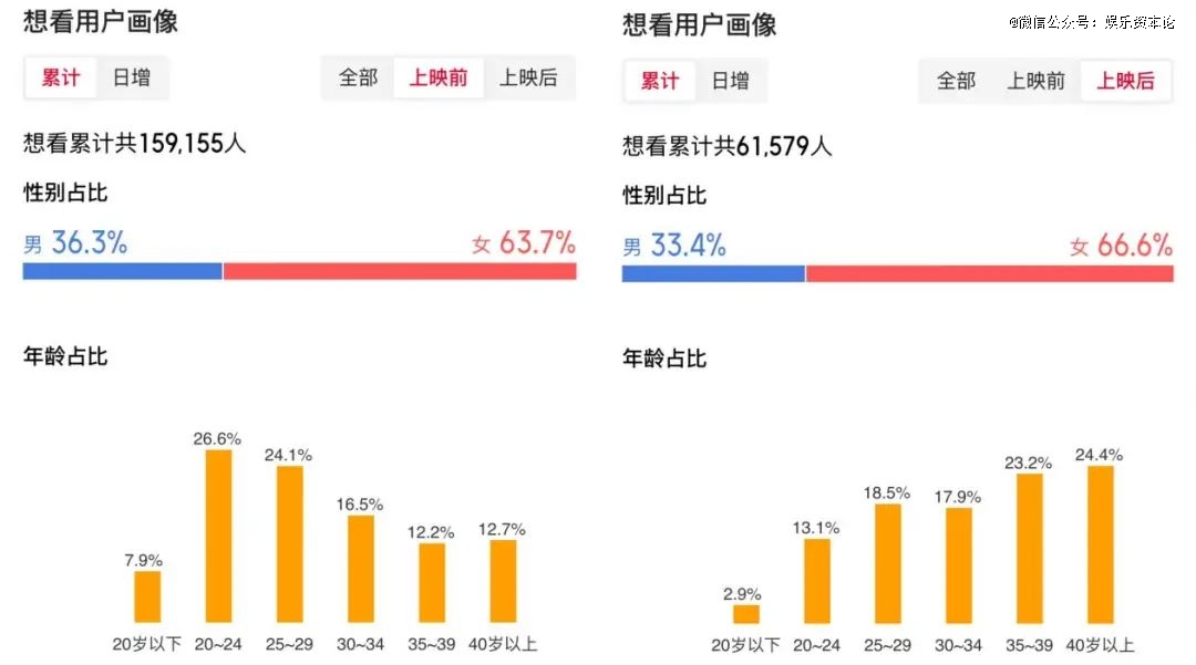 从猫眼想看数据来看,《浪浪山小妖怪》上映前以年轻受众为主,29岁以下用户占六成,20岁以下有7.9%,20-29岁为主力军,符合年轻打工人画像。上映后的想看画像明显向更高年龄层迁移,30岁以上占65%以上,35岁以上用户为主力,亲子用户更多,观众画像逐渐延展到全年龄层。