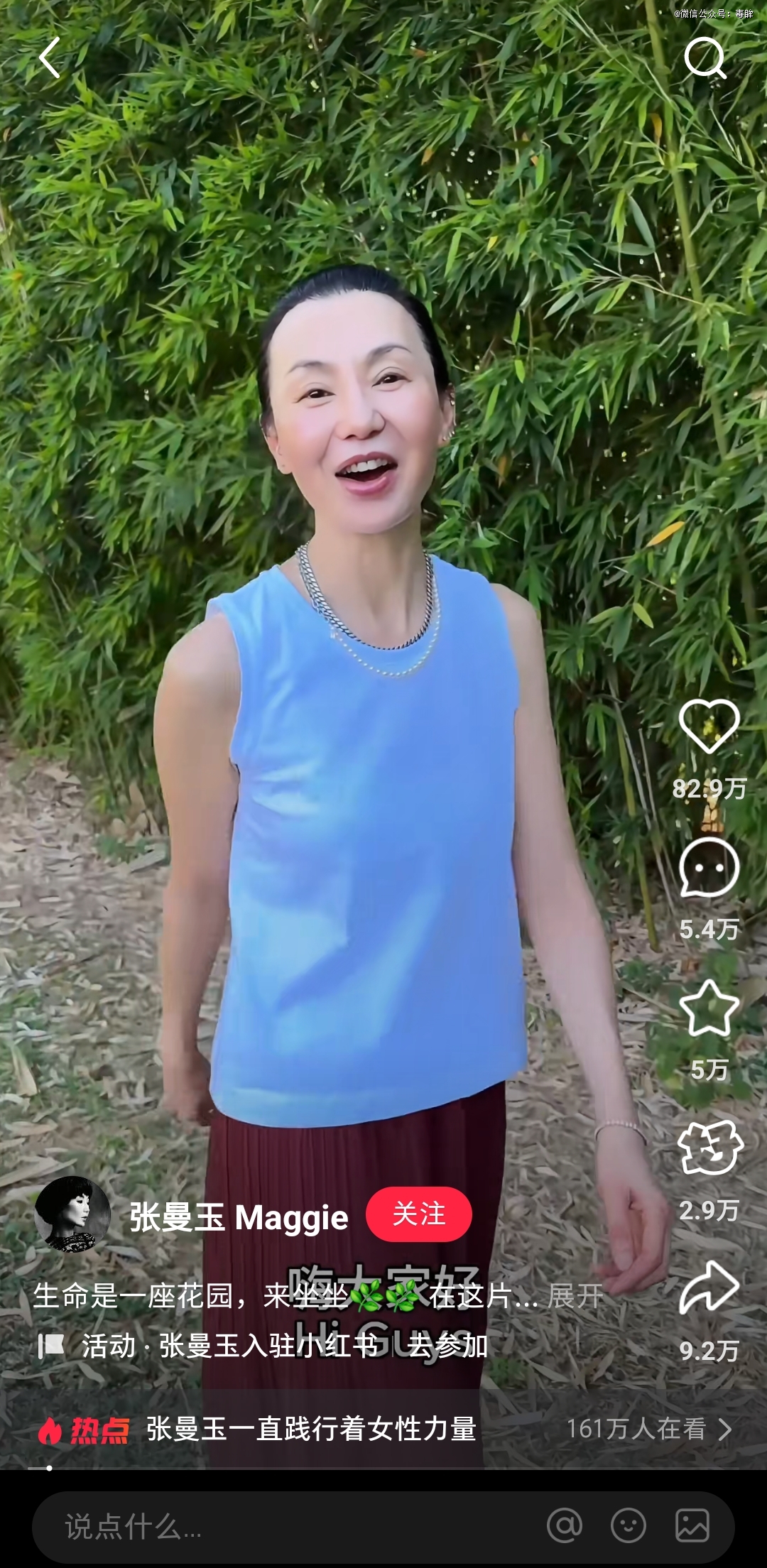 在视频中,张曼玉将小红书账号称为自己的“花园”,欢迎朋友来坐坐,还谈到了自己对账号内容的规划,视频剪辑了26个场景,有一种“过时”的真诚感,和对社交平台“不合时宜”的兴奋感。