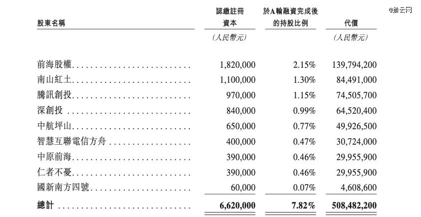 当时,一共9家机构进场,主要都是深圳的头部VC,其中,前海FOF(包括:前海股权 、中原前海及智慧互联电信方舟)投入2亿元,深创投资本(包括深创投、南山红土)投入1.49亿,腾讯创投投入7450万元。