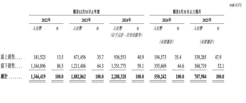 报告期内,线上销售产生的收入持续提升,从2022年的占比13.5%提升至2024年的40.9%,再到2025年*季度,占比更是达到47.9%,几近与线下产生的收入持平。