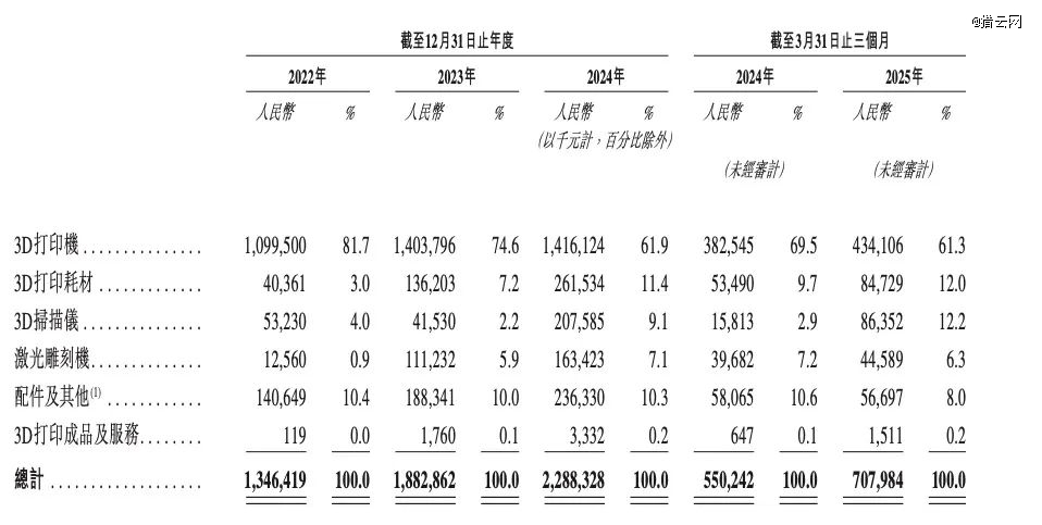 其中,3D打印机为营收主要收入来源,占比呈现下滑的趋势,2022年至2024年,其占比分别为81.7%、74.6%、61.9%,2025年*季度,占比更是进一步下滑至61.3%。