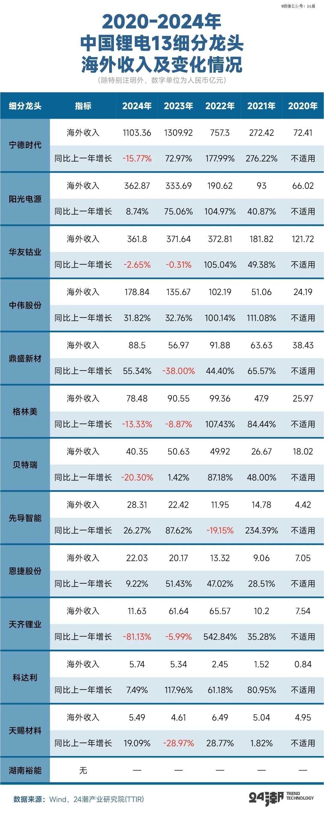 为了让读者朋友对中国锂电产业链全球化进展与成果有一个直观的了解,24潮产业研究院(TTIR)统计了宁德时代(300750.SZ)、天齐锂业(002466.SZ)、中伟股份(300919.SZ)、湖南裕能(301358.SZ)、贝特瑞(835185.BJ)、天赐材料(002709.SZ)、科达利(002850.SZ)、恩捷股份(002812.SZ)、鼎盛新材(603876.SH)、阳光电源(300274.SZ)、先导智能(300450.SZ)、格林美(002340.SZ)、华友钴业(603799.SH)等13个中国锂电产业链龙头企业在2020-2024年海外收入与海外基地建设等方面核心数据:整体看,从五年维度观察,中国锂电产业在全球化方面取得了一些成绩,13龙头企业整体海外收入从2020年的391.56亿元增长至2024年的2287.40亿元,增幅为484.18%;不过我们也可以看到全球化并非一路坦途,2024年13细分龙头海外收入同比下降了7.14%,五年间,海外收入占营业收入比例仅增长了6.48个百分点。