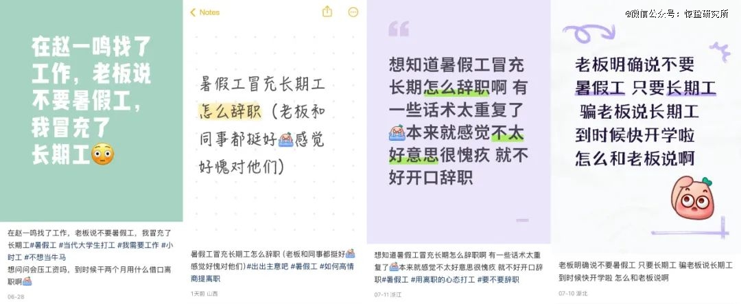 即便冒充长期工顺利入职,学生们很快又会陷入新的焦虑,有人担心隐瞒身份被发现后工资会被扣,有人求助该用什么理由跟老板开口提离职......在小红书平台上,这类求助帖子并不少见,字里行间也满是职场新人的忐忑。