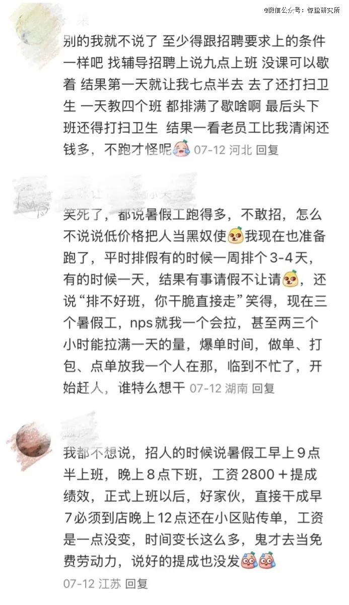 但学生群体对暑假工的需求从未消减。打开社交平台就能发现,即便不少人在吐槽打工时遭遇的压榨、区别对待,仍有大量学生在为找不到暑假工而焦虑。雨菲也告诉惊蛰研究所,“一到暑期,打电话求职的特别多,一天最少有二三十个。”而供需失衡又加剧了“冒充长期工”的畸形现象。