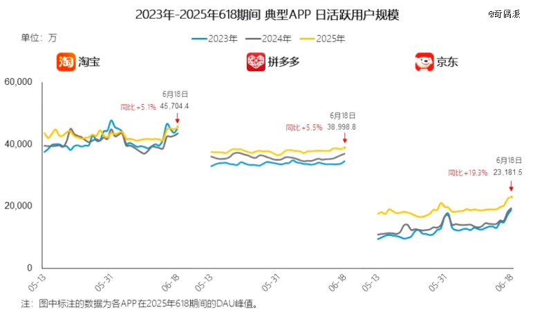 得益于此,外卖正在成为驱动用户活跃与平台增长的关键引擎。2025年618大促期间,淘宝日活跃用户同比增长5.1%,达到4570万;而京东因全面投入外卖的补贴竞争,日活用户同比大幅增长19.3%,攀升至2318万。