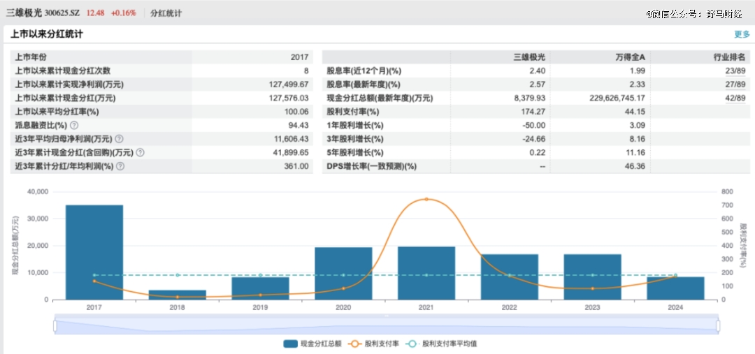wind显示,三雄极光自2017年上市以来,连续8年分红,8年以来三雄极光实现净利润累计12.75亿元,累计分红12.76亿元,平均分红率100.06%。