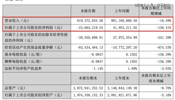 三雄极光于2025年8月22日公布的半年报显示,公司上半年营业总收入8.19亿元,同比下降16.49%;更严重的是,净利润从去年同期的盈利4195.33万元变成了亏损2366.42万元。这也是公司自2017年上市以来首次出现半年度亏损。