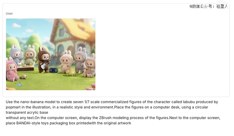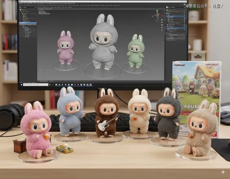 直接上传一张Labubu的商品图,并复制修改了这段广为流传的手办Prompt,生成结果如下: