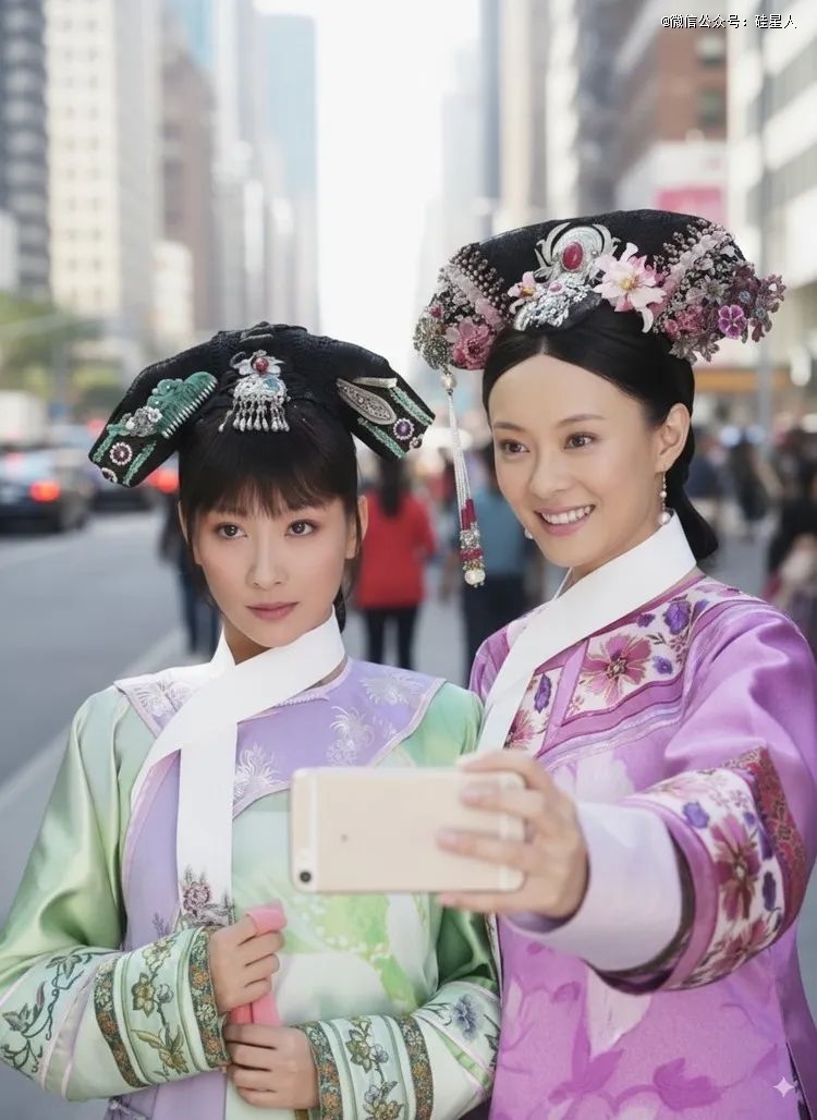 接下来,我们又尝试了多张图片融合,据官方介绍能够保持人物的一致性,目前最多可支持三张图片合成,我们尝试了一下让甄嬛和安陵容来到现代都市,并且要求保持复杂的中国传统首饰不变形。