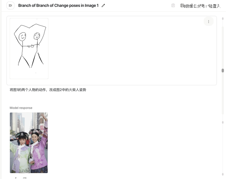 如果觉得这个姿势不够满意,甚至可以通过简笔画的方式,让AI直接理解图片示例,比如我们直接告诉AI,姿势照着图二修改。