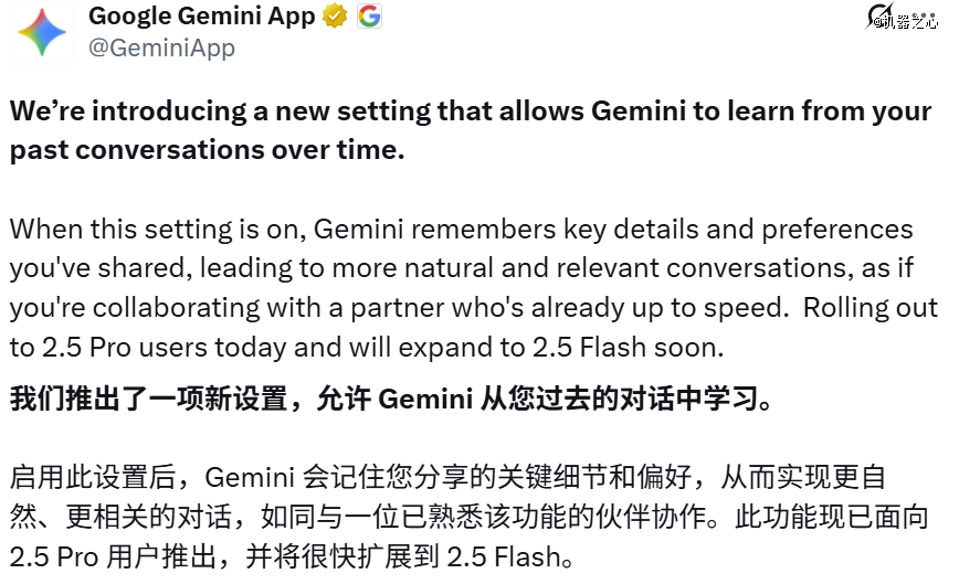 前些天,谷歌宣布 Gemini 具备了记忆能力。此前,它已经凭借长达 100 万 token 甚至更高的上下文长度,在「短期记忆」上有不错表现 —— 能够在一次会话中保留大量信息。但这一次,Gemini 可以跨越多次对话,从用户的交流中提炼关键细节和偏好,并在下一次交互时主动调用,让对话更自然、更连贯。