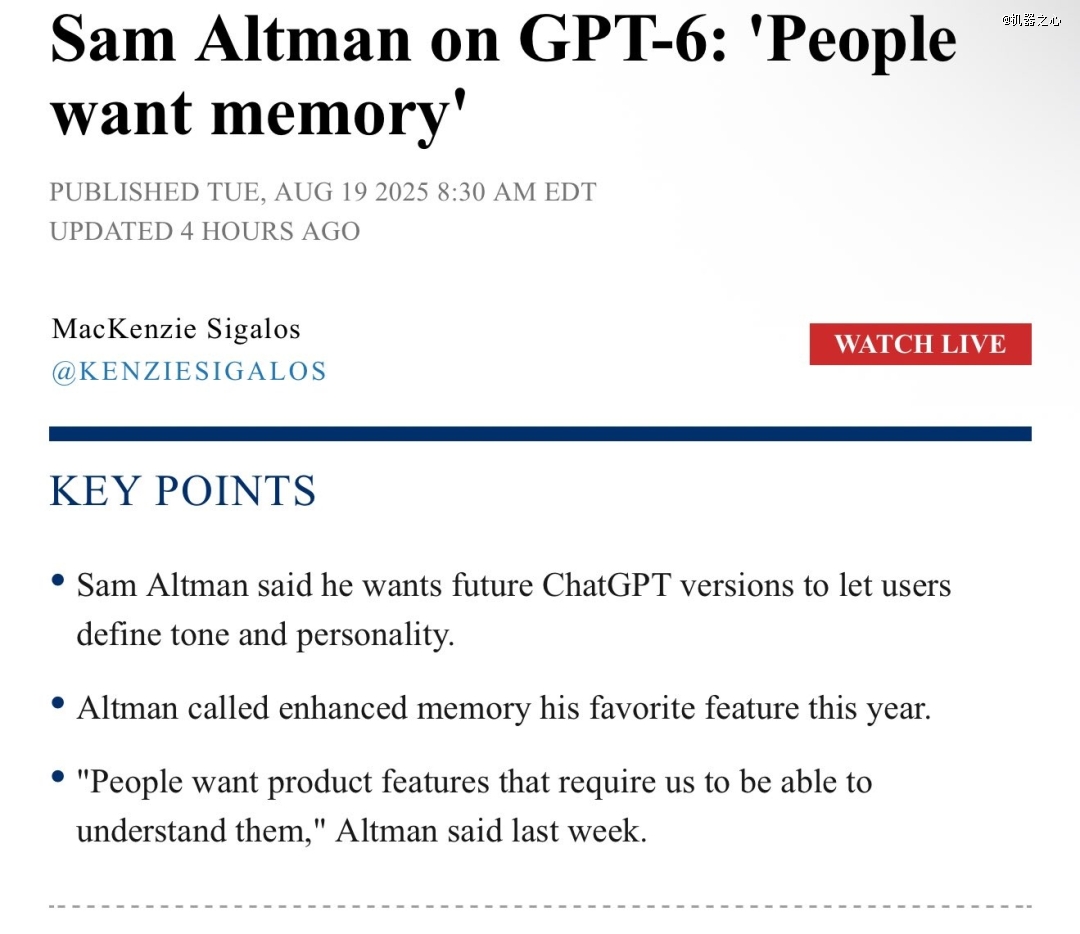 前些天,该公司 CEO 山姆・奥特曼更是表示 GPT-6 的一大改进核心也将会是记忆。他表示:「人们想要记忆,人们想要那些需要让 AI 能够理解他们的产品功能。」