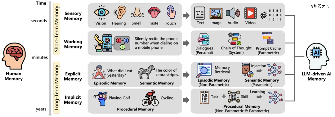 人类记忆与 LLM 记忆的对比,图源:arXiv:2504.15965