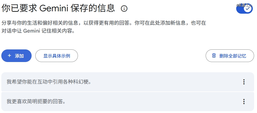 而 Gemini 看起来与 ChatGPT 的功能类似,另外还支持用户自己录入想要 Gemini 记住的东西。