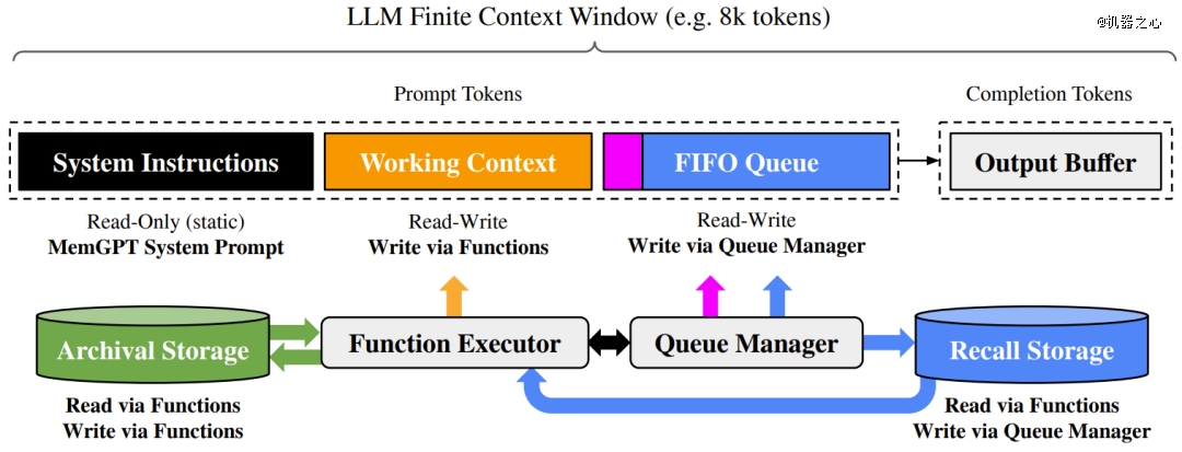 如上图所示,在 MemGPT 中,一个有着固定上下文长度的 LLM 处理器配备了分层内存系统和一些函数,使其能够管理自身的记忆。这个 LLM 的提示 token(输入,即主上下文)由系统指令、工作上下文和 FIFO 队列组成。LLM 的完成 token (输出)会被函数执行器解释为函数调用。MemGPT 使用函数在主上下文和外部上下文(归档和调用存储数据库)之间移动数据。LLM 可以通过在其输出中生成一个特殊的关键字参数 (request heartbeat=true) 来请求立即进行后续的 LLM 推理,从而将函数调用链接在一起;函数链使得 MemGPT 能够执行多步检索来回答用户查询。