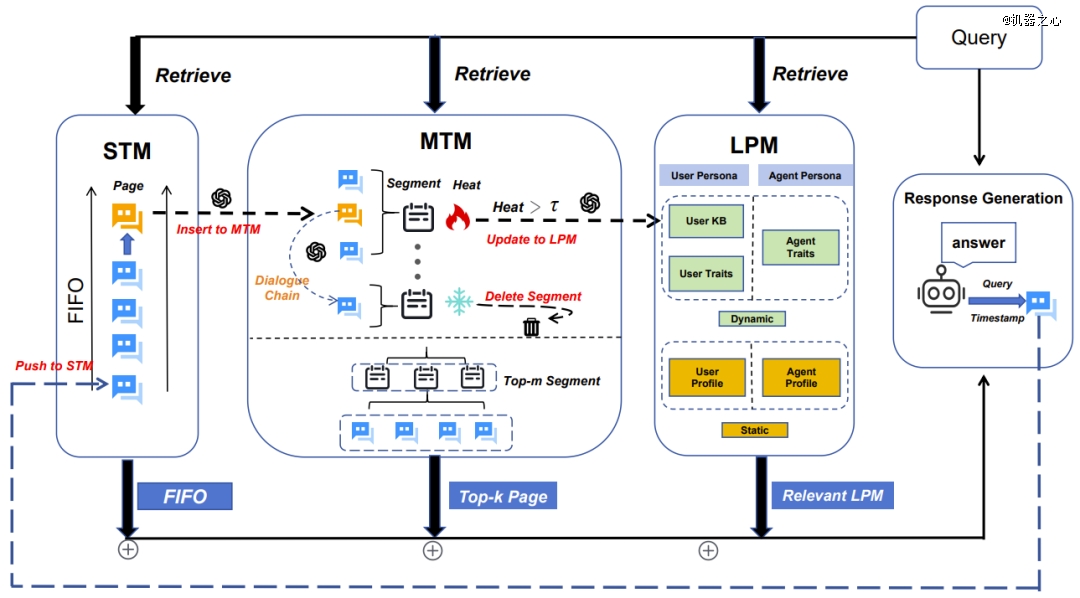 无独有偶,北邮百家 AI 团队推出的 MemoryOS 则巧妙融合了计算机操作系统原理与人脑分层记忆机制,构建段页式三级存储架构及四大核心模块(存储、更新、检索、生成),提供全链路用户记忆管理方案,让 AI 智能体拥有持久「记性」与深度「个性」。