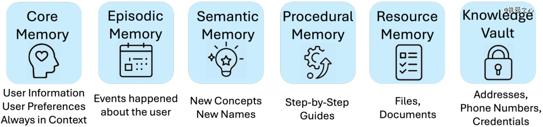 在这方面,MIRIX 是近期一个较为亮眼的项目,其将记忆细分成了 6 类来进行处理:核心记忆、情景记忆、语义记忆、程序记忆、资源记忆、知识金库。