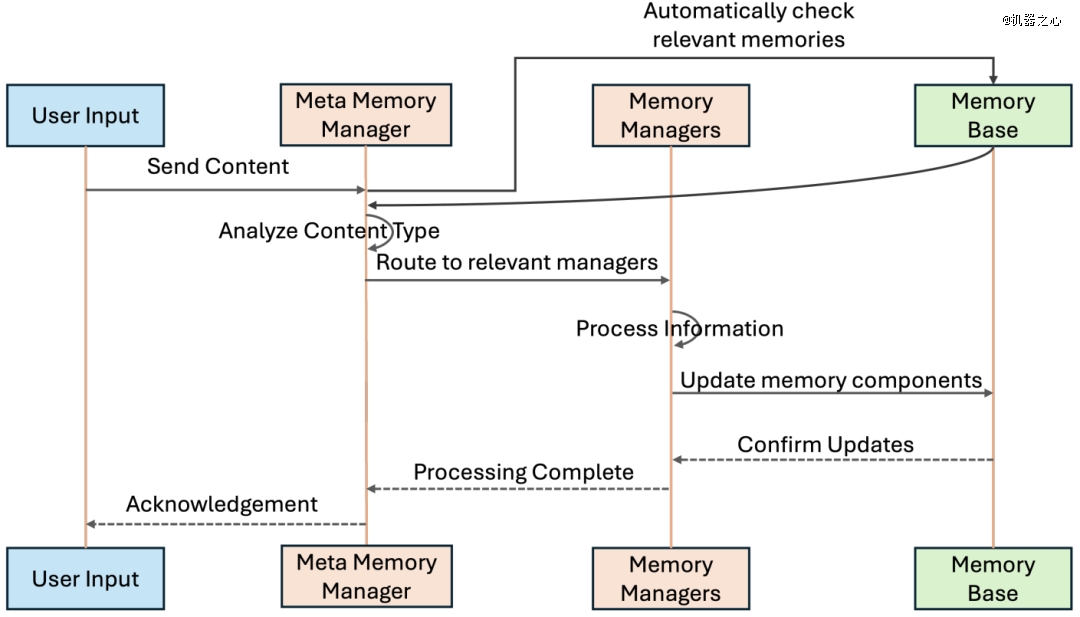 具体来说,他们提出了一种模块化多智能体架构,由若干专用组件在统一调度机制下协作完成输入处理、记忆更新和信息检索。整个系统包括:元记忆管理器(Meta Memory Manager)、记忆管理器(Memory Managers)以及对话智能体(Chat Agent)。