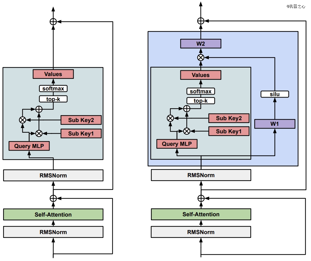 左图为常规记忆层,右图为改进的 Memory+ 模块,图源:arXiv:2412.09764