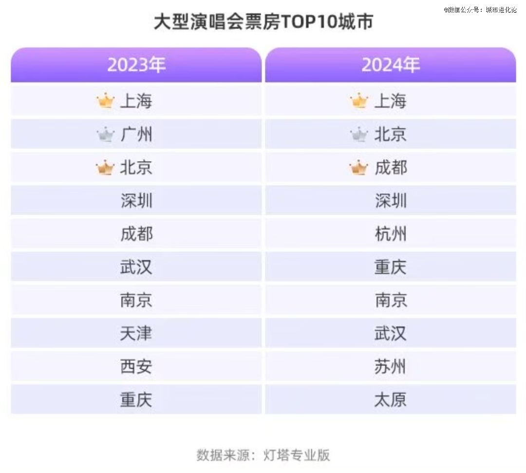 向好的增势不变,但增长的格局变了。根据《报告》统计,去年,上海、北京、成都、深圳和杭州分居大型演唱会票房前十城市,其中,杭州增长尤为明显,从2023年十名开外一跃升至第五。杭州文广旅局发布的数据显示,去年杭州演唱会、音乐节演出场次同比大增470.37%,票房收入同比增长480.9%。