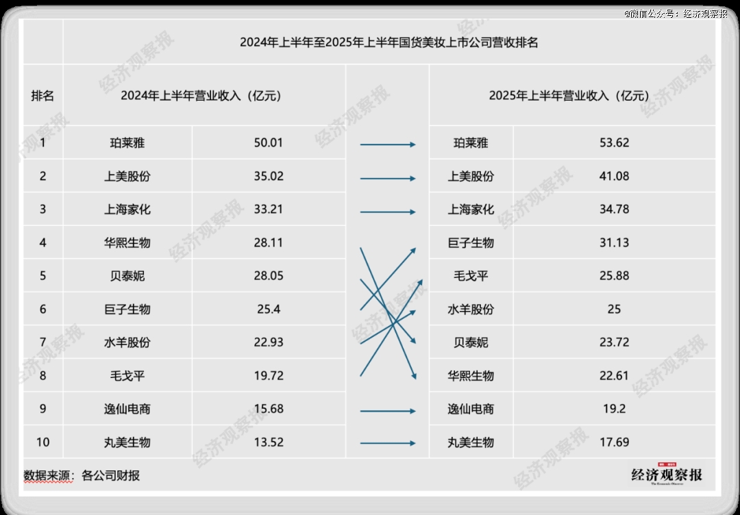 按营业收入排序,与2024年上半年相比,珀莱雅、上美股份与上海家化保持前三位不变,逸仙电商(YSG.US)、丸美生物(603983.SH)保持末两位不变。
