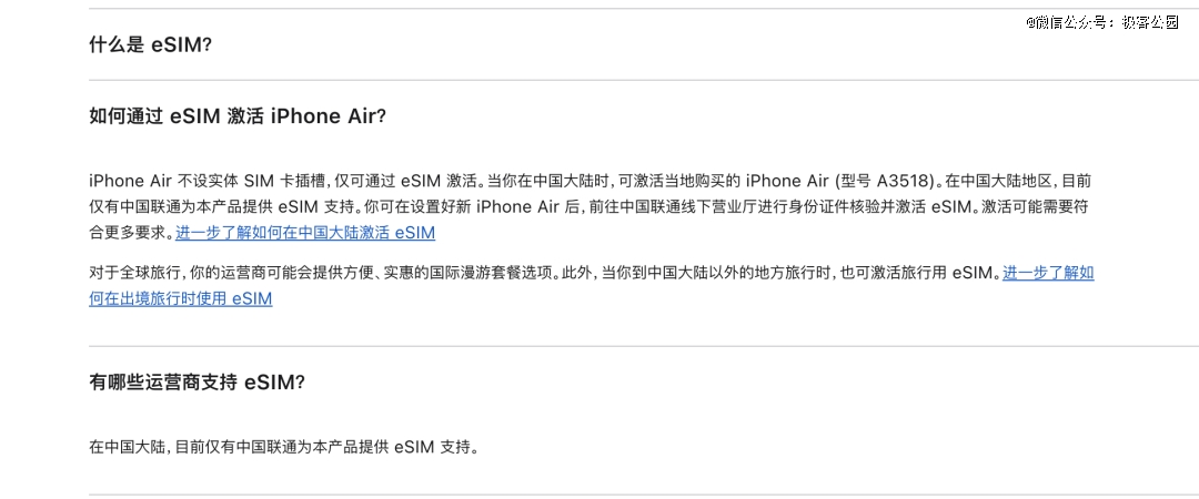除了设计,iPhone Air 显然还需要回答另一个更重要的问题,那就是 eSIM 在中国大陆地区的落地进度如何,这显然也是最多用户关心的「细节」之一。