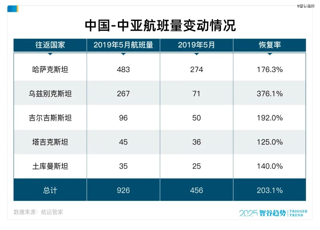 对比2019年,中欧、中 美航班冷清了,但中国飞中亚的航班量却越来越密集,逆势增长了103.1%。