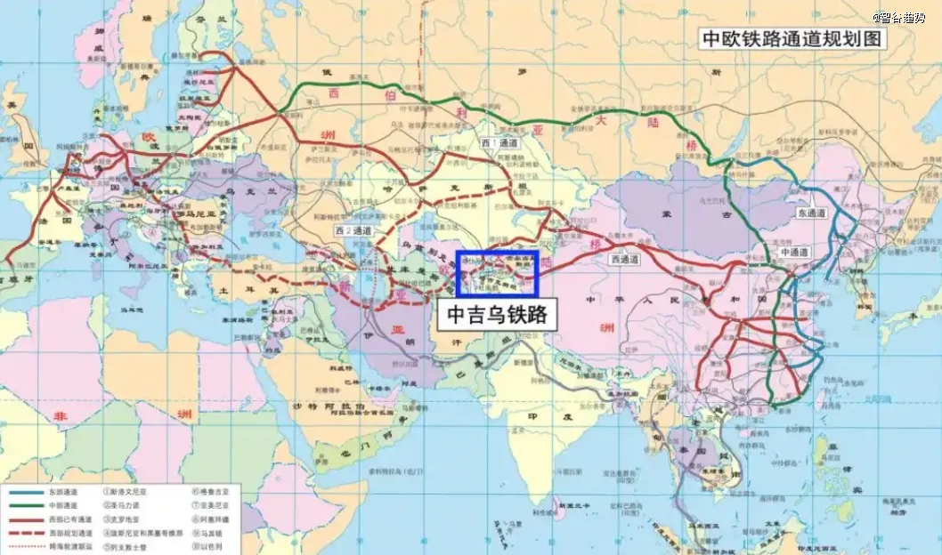中吉乌铁路一旦建成,将与外高加索走廊相连,成为第三条亚欧大陆桥。作为全球最短的欧亚大陆桥,以后从新疆喀什出发把货物运往欧洲,将比之前缩短900公里,节省七到八天。