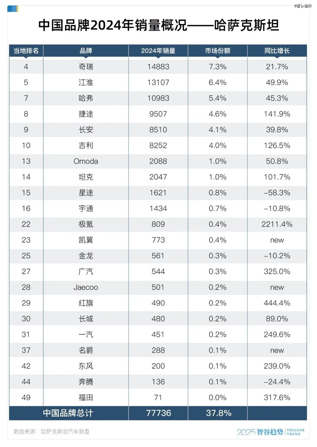 国产汽车品牌,奇瑞、江淮、长城、长安、吉利等车企,早在二十多年就进入了中亚市场,已经成了中亚的全民品牌。2024年,奇瑞、江淮、长城哈弗分别在哈萨克斯坦卖出14883、13107、10983台,市场份额分别为7.3%、6.4%、5.4%。