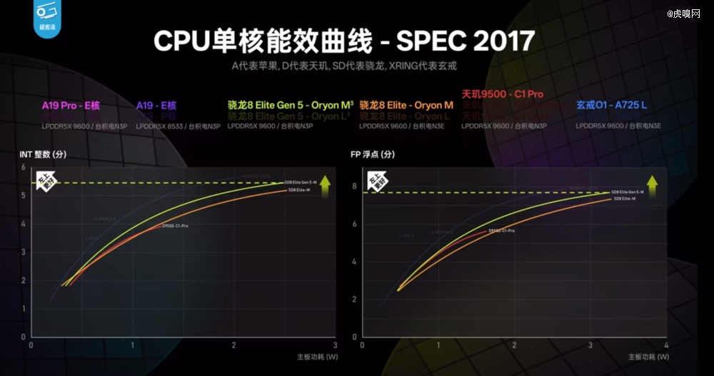 9月25日,@极客湾Geekerwan对新发布的第五代骁龙8*版进行了性能测试。一个比较令人震惊的结果是,在SPEC 2017套件上,作为一款今年上半年发布的芯片,玄戒O1的“性能核”能效表现逼近了刚发布骁龙8Gen 5,“能效核”表现甚至超过了后者。