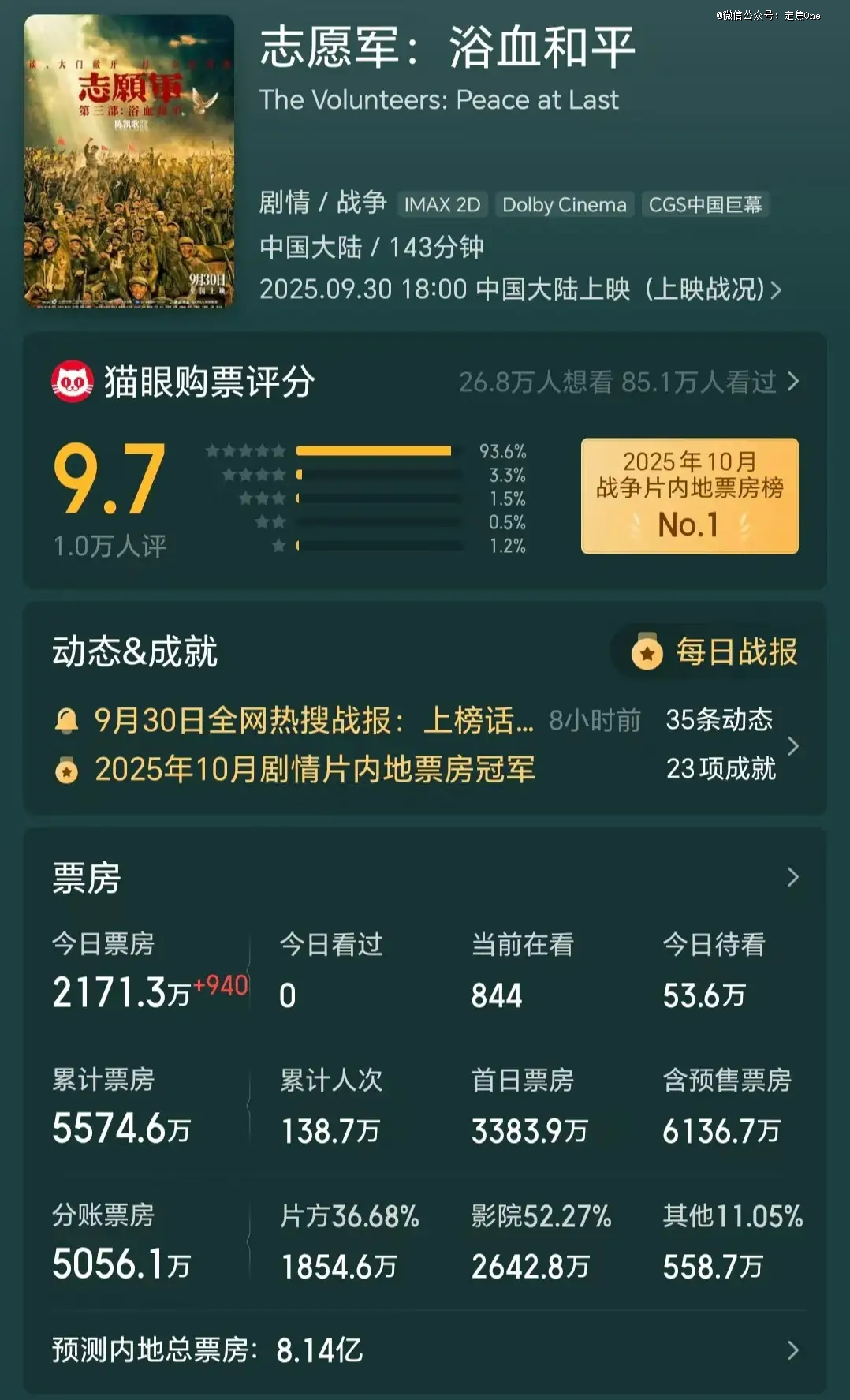 率先领跑的《志愿军3》是国庆档*一部主旋律大片,作为该系列的收官之作,被很多从业者视为国庆档的种子选手。