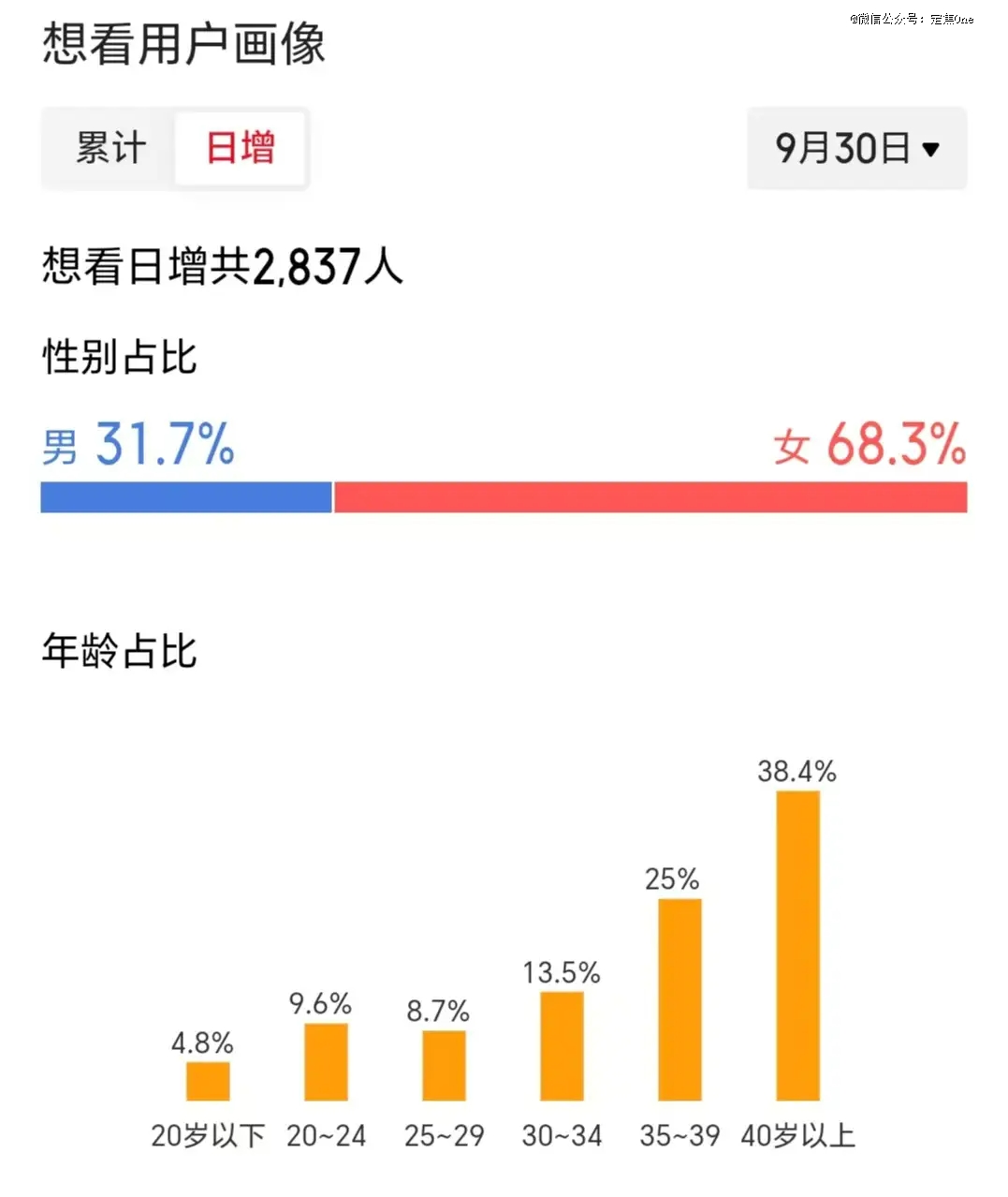 猫眼专业版显示,《志愿军3》的想看用户画像中,其40岁以上年龄层占比最高。同样受这一年龄段观众喜欢的还有《三国的星空*部》,其中女性占比逼近70%。