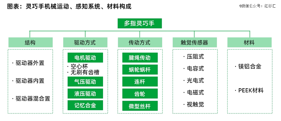 灵巧手最核心的部分在于它的机械和结构设计,可分为结构形式、驱动方式、传动方式、感知方式和材料等多方面。当前,灵巧手行业还未形成统一的技术标准,多家技术路线并存,对于哪一种技术路线更有优势尚无定论,这种“百家争鸣”的局面,尤其体现在最关键的三大部件上——驱动方式、传动方式和传感器。