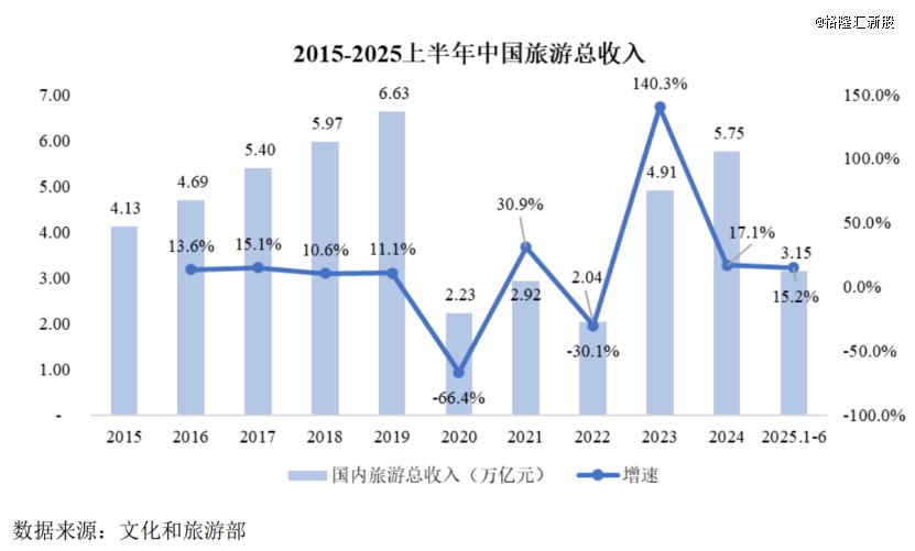 2025年上半年,国内旅游人次为32.85亿人次,同比增长20.6%;国内旅游收入为3.15万亿元,同比增长15.2%。