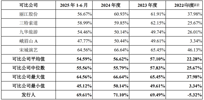 报告期各期,陕西旅游的主营业务毛利率分别为-5.32%、69.49%、71.10%和69.61%,波动较大。其中,2022年公司毛利率较同行业可比公司偏低;2023年公司毛利率高于同行可比公司均值,除文旅市场强劲复苏以外,公司冬季版《长恨歌》受到市场的广泛认可,对传统淡季收入实现了有力的补充。