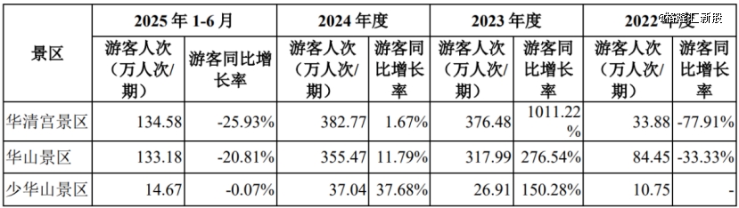 华清宫及华山景区在2023年游客人次明显增加,2024年游客同比增速放缓,2025年1-6月游客同比增长率均下滑20%以上。