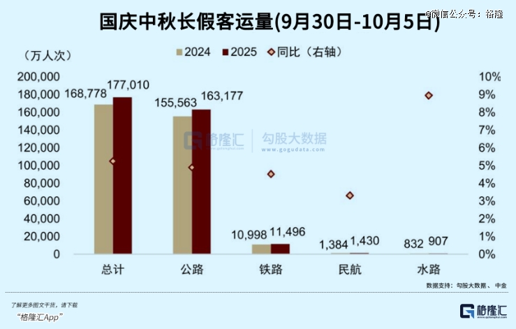 从出行方式来看,铁路、水路、航空、公路分别同比增长2.6%、4.2%、3.4%、6.5%。