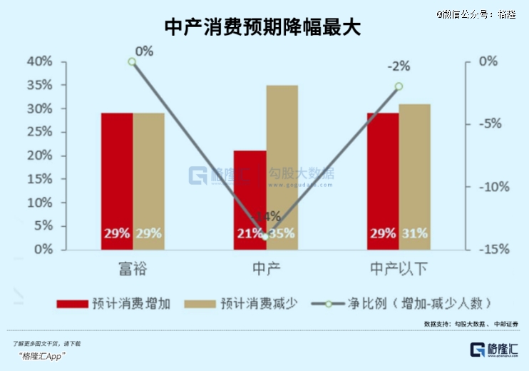 然而看下图,中产群体预期消费的减少幅度高达35%,远远高于富裕和以下人群。