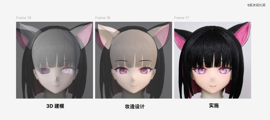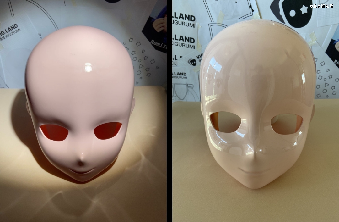 大体上一个头壳有3个组成部分,3D打印的硬质脸壳、手作假发和妆面。