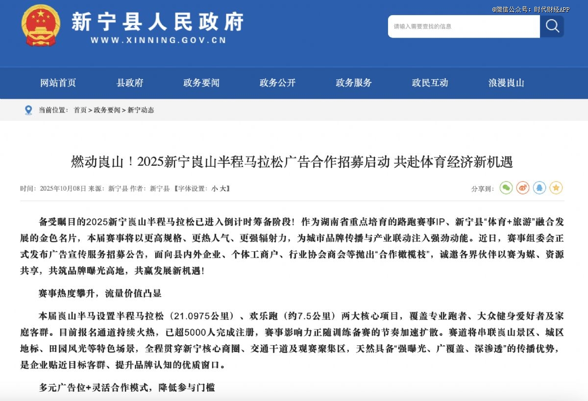 杨松透露,“许多赛事运营的同行也是这个情况,大家都是被直接通知取消。”时代财经留意到,2025新宁崀山半程马拉松在10月11日发布比赛取消通知,而新宁县人民政府官网10月8日还在招募赛事的广告合作商。